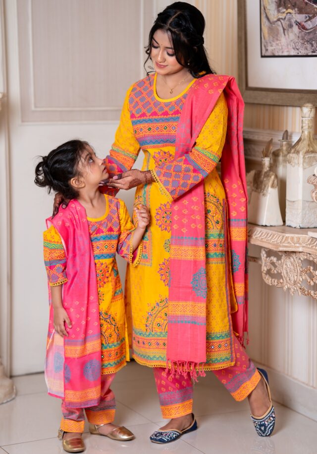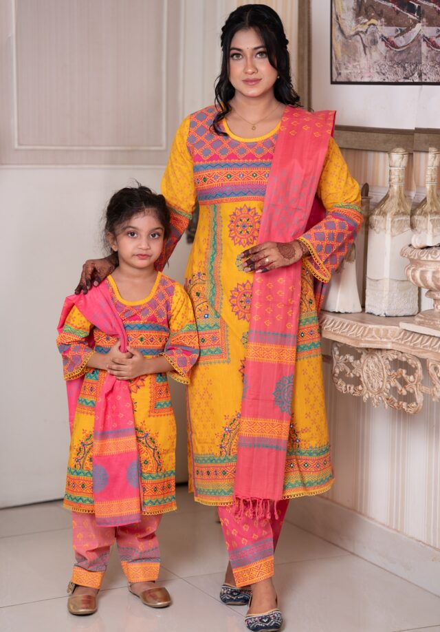 সেট অন্তর্ভুক্ত: কামিজ, ওড়না, পাজামা (মা ও মেয়ে)