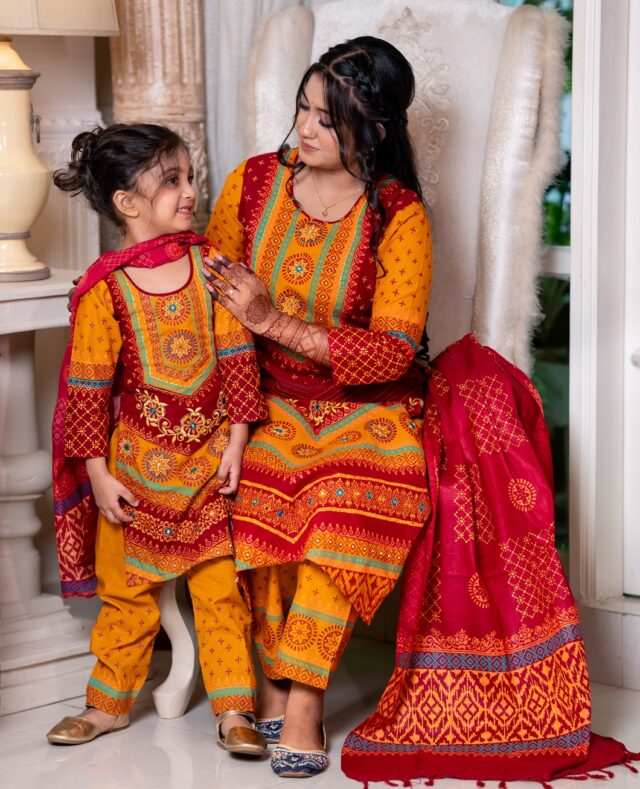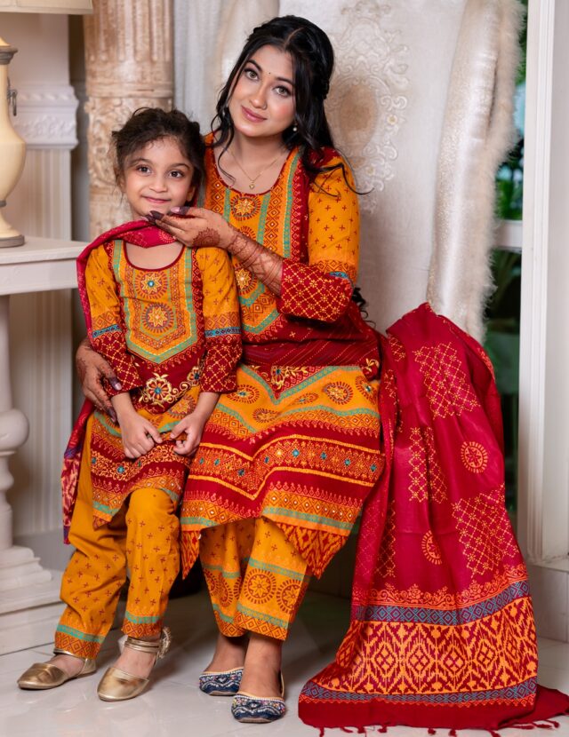সেট অন্তর্ভুক্ত: কামিজ, ওড়না, পাজামা (মা ও মেয়ে)